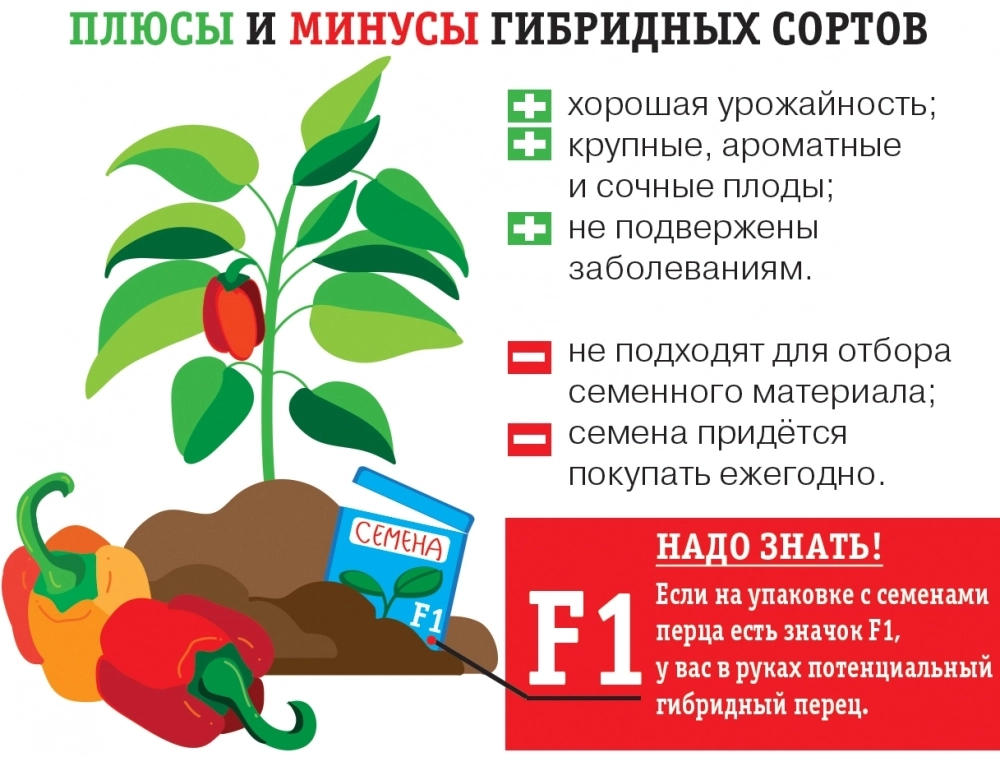 Начинать, конечно же, надо с самого первого этапа — выбора семян подходящего сорта. А вот здесь садоводов может поджидать первая ловушка. Дело в том, что в специализированных магазинах продаются в основном гибридные сорта перца. Некоторые из них выведены специально для наилучшего произрастания в условиях средней полосы России и приспособлены для выживания при обильных дождях и низких ночных температурах. Всё это должно быть указано на упаковке семян при перечислении характеристик сорта. Но вот потомства от гибридных сортов ждать не стоит!