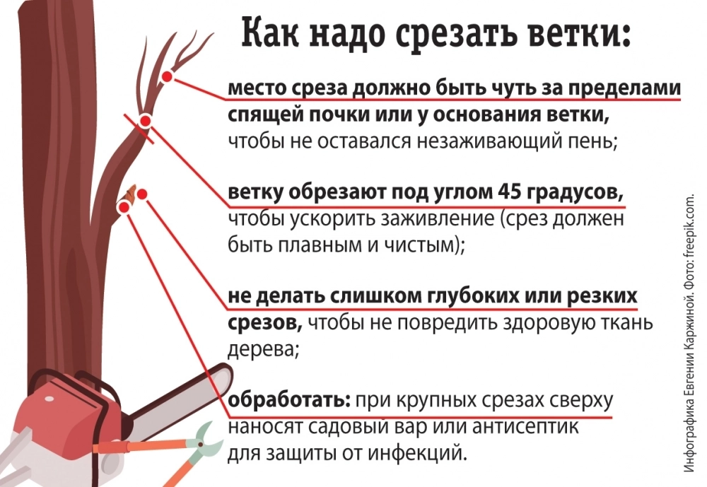 Хочу обратить внимание на ещё один момент: к обрезке дерева надо подходить во всеоружии. То есть с полностью готовым инструментом, который должен быть идеально заточен, что позволит снизить риски заражения дерева какими-либо инфекциями. Кроме этого, советую перед началом работы обеззаразить инструменты спиртом или раствором марганцовки.