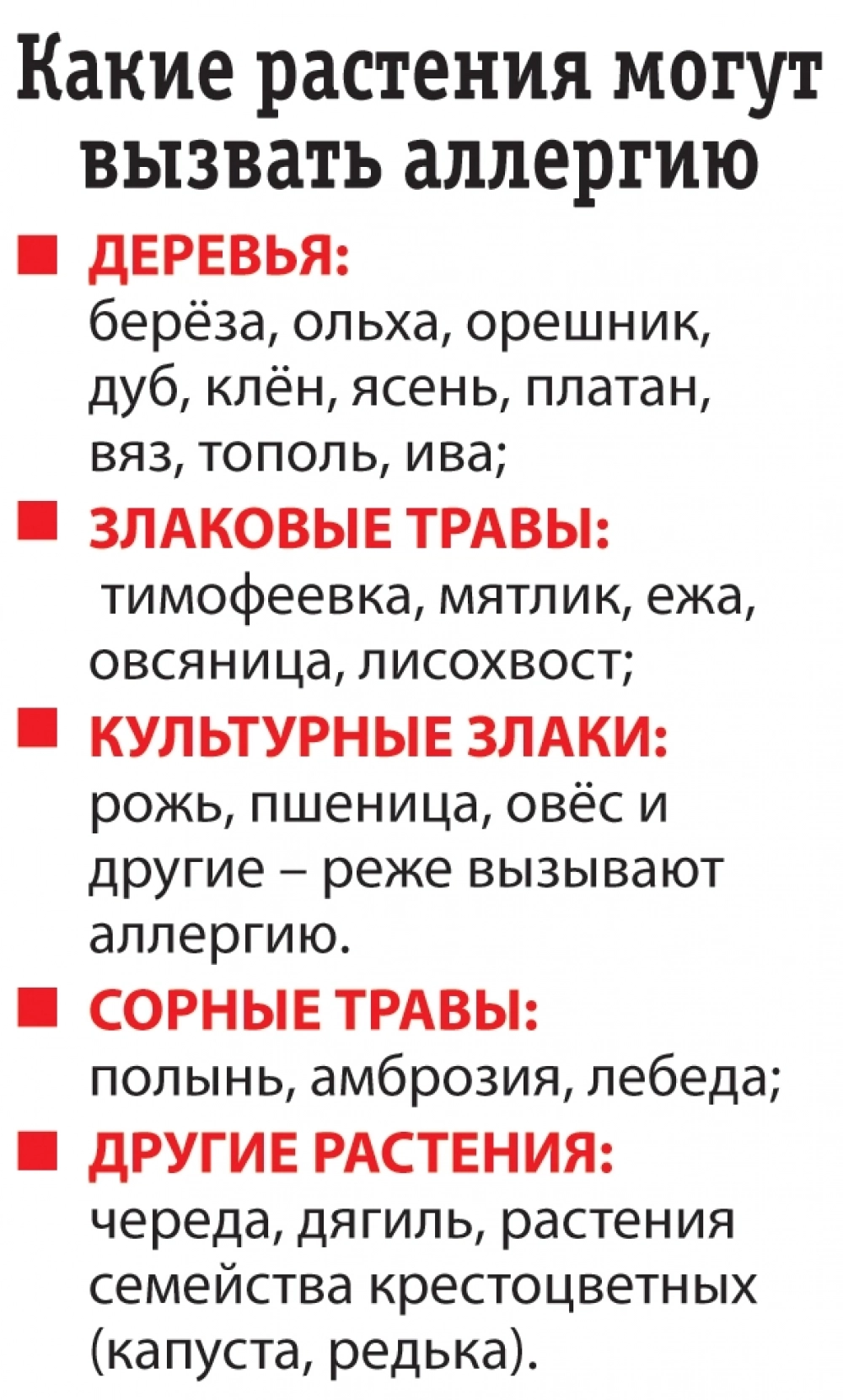 Специалист отмечает, что аллергия на пыльцу различных растений в принципе не различается, то есть симптомы в виде зуда в носу, чихания, слезотечения, крапивницы и дерматитов будут наблюдаться независимо от того, с пыльцой какого растения человеку пришлось столкнуться. Но среди них есть и наиболее опасные.