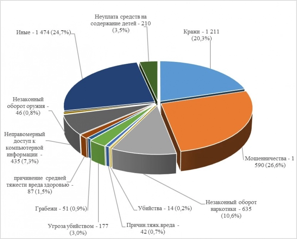 - на 15,4 % (с 1 432 в прошлом году до 1 211 — в текущем) снизилось число краж. Также улучшилась их раскрываемость (с 57,2 % до 63,3 %). На 21,8% снизилось число краж с банковского счета или в отношении электронных денег (327 случаев);