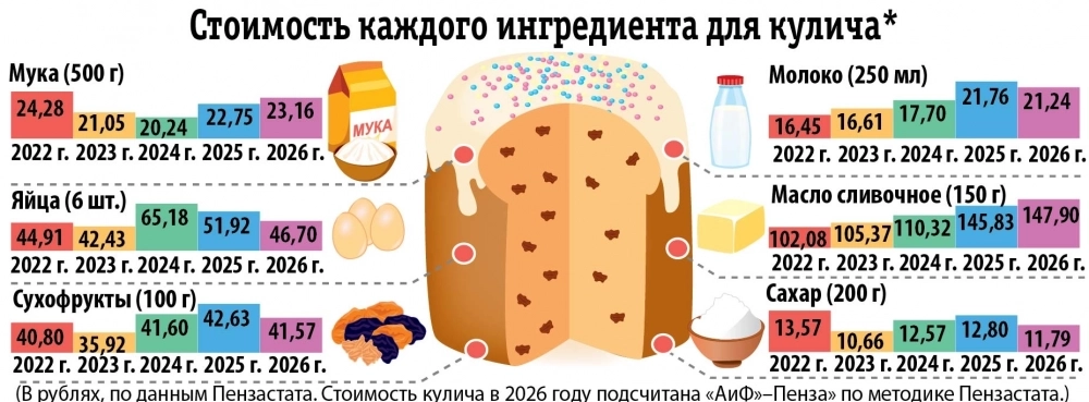 Если ориентироваться на цены Пензастата, то можно увидеть, что дешевле всего кулич был в 2023 году, а дороже всего в 2025 году (когда цены на яйца, наоборот, снизились). Так что если речь идёт о куличах, то не в яйцах дело. Самый дорогой ингредиент для кулича — сливочное масло. И дорожает кулич именно из-за него, а не из-за яиц, как предполагали пензенцы.