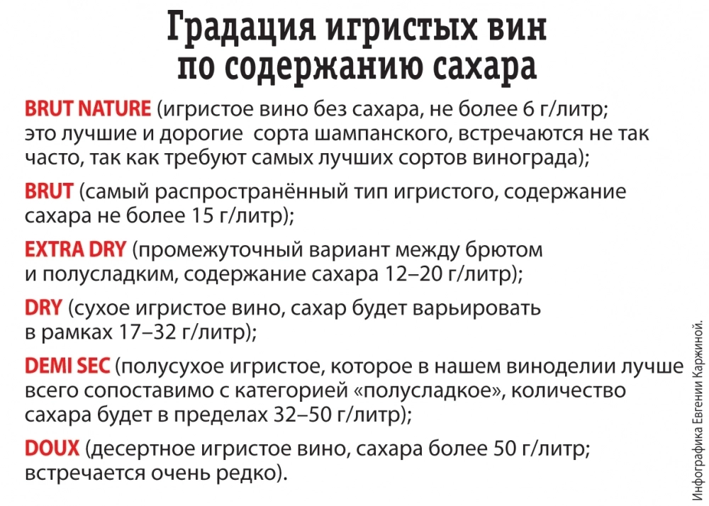— О количестве содержания сахара в напитке. Градаций гораздо больше, чем вы назвали, обычному человеку разобраться в них и подобрать для себя наилучший вариант сложно. На вкус игристого вина влияет температура подачи напитка, форма бокала и даже скорость розлива. Поэтому мы удивляемся тому, что за год одно и то же игристое вино как-то изменилось. Ведь воссоздать условия, при которых вы его пробовали в прошлый Новый год, вряд ли получится.