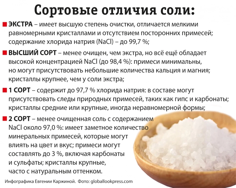 В пищевой соли вот уже несколько десятилетий выделены 1 и 2 сорта, а также высший сорт и самый лучший, соответственно дорогой, — экстра. Градация происходит как по степени очистки, так и по содержанию в продукте непосредственно хлорида натрия. Учитывается и количество примесей, которое также зависит от качества очистки.