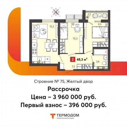 Например, 2-комнатная квартира на планировке – с изолированными комнатами и просторной кухней – стоит 3 960 000 рублей. А значит, минимальный первый взнос – 396 000 рублей.