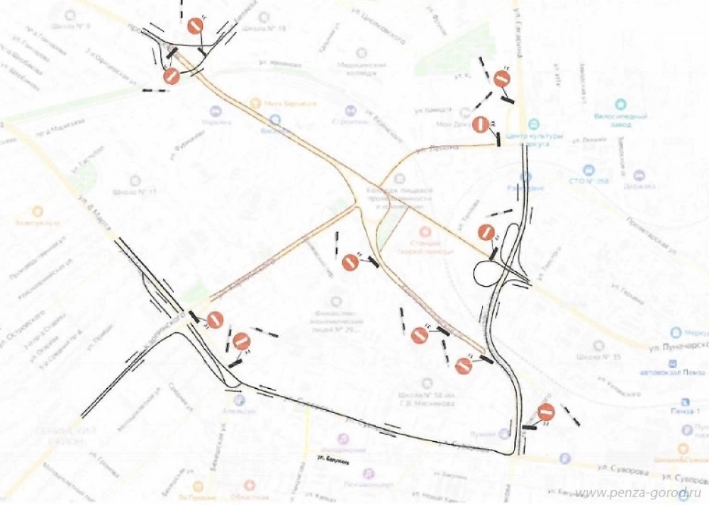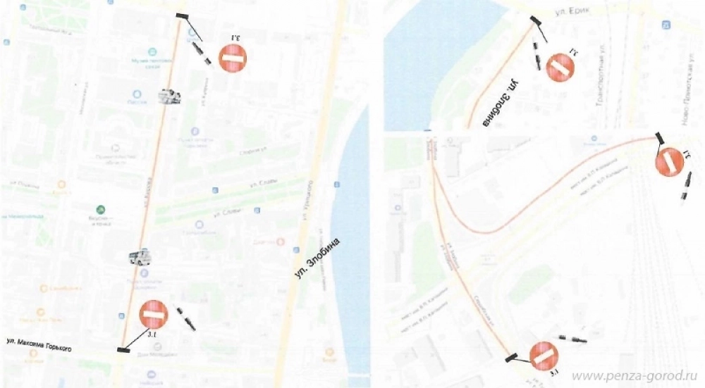 - с 20:00 до 23:00 на улице Кирова от Максима Горького до Бакунина, на улице Злобина на участке от улицы Сердобской (напротив дома № 2) до улицы Бакунина (напротив дома № 4 - начало Бакунинского моста), с начала съезда с моста имени В.П. Капашина на улице Ерик до улицы Сердобской.