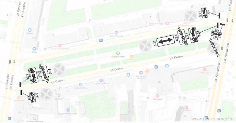 - с 8:00 до 23:30 (за исключением общественного транспорта) - на улице Славы от Кирова до Урицкого, на улице Урицкого от Максима Горького до Бакунина;