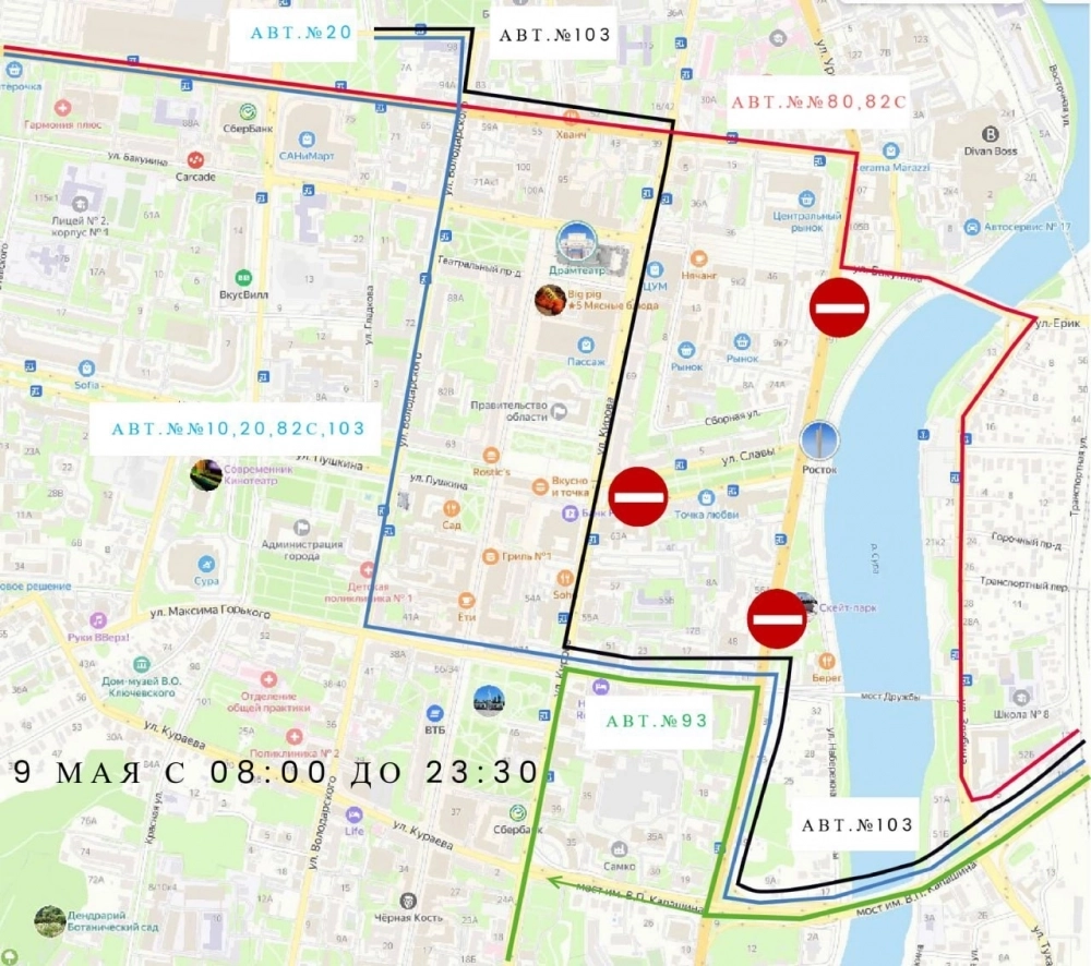 - №9К - с улицы Суворова направят по улицам Володарского - М. Горького - Урицкого - мост. им. В.П. Капашина и далее по маршруту. После 21:00 транспорт прекратить движение.