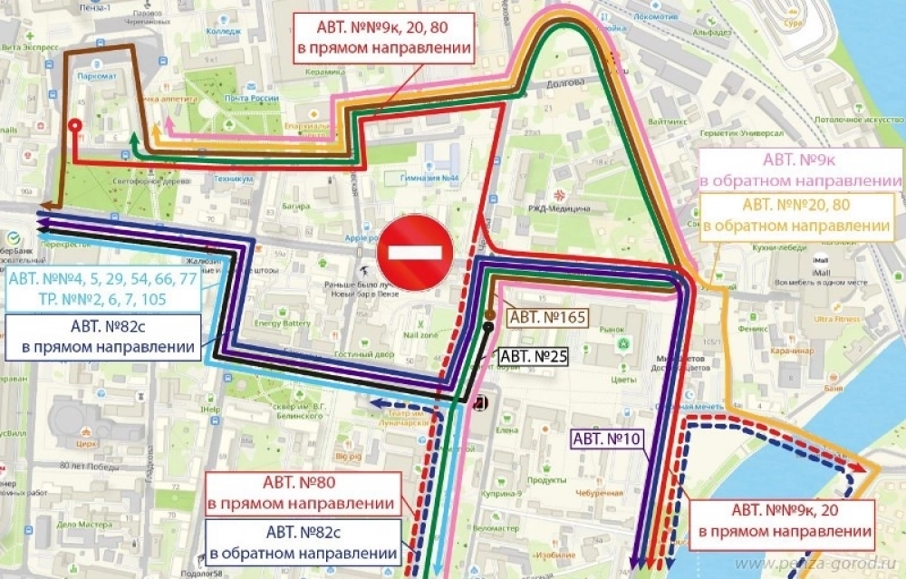 В указанный период маршрутки № 4, 5, 29, 77, автобусы № 54 и № 66, троллейбусы № 2, 6, 7, 105 с улицы Кирова направят по улицам Бакунина – Володарского – Суворова, затем они вернутся к обычной схеме движения.