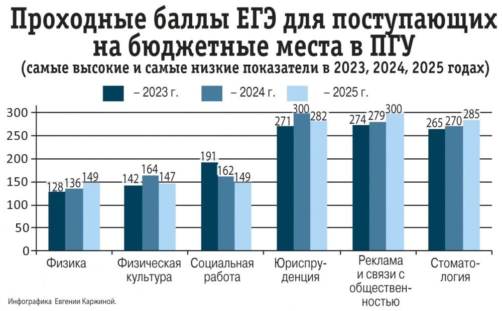 Проходные баллы ЕГЭ для поступающих на бюджетные места в ПГУ (самые высокие и самые низкие показатели в 2023, 2024 и 2025 гг.).