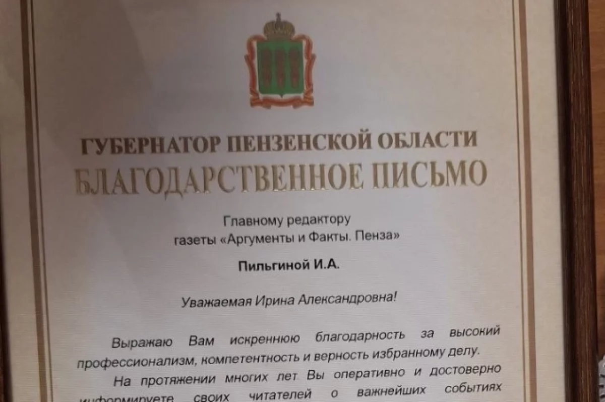 Главному редактору «Аргументы и факты» — Пенза» Ирине Пильгиной вручили Благодарственное письмо от губернатора Пензенской области Олега Мельниченко.
