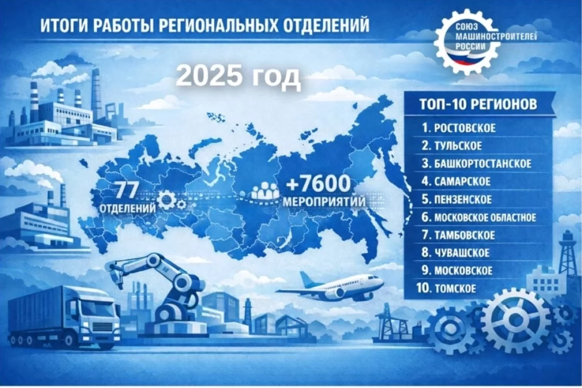 В 2025 году 77 региональных отделений Союза машиностроителей России провели более 7 600 мероприятий, охватывающих широкий круг задач — от участия в формировании мер поддержки промышленных предприятий до реализации социальных и гуманитарных инициатив в субъектах Российской Федерации.