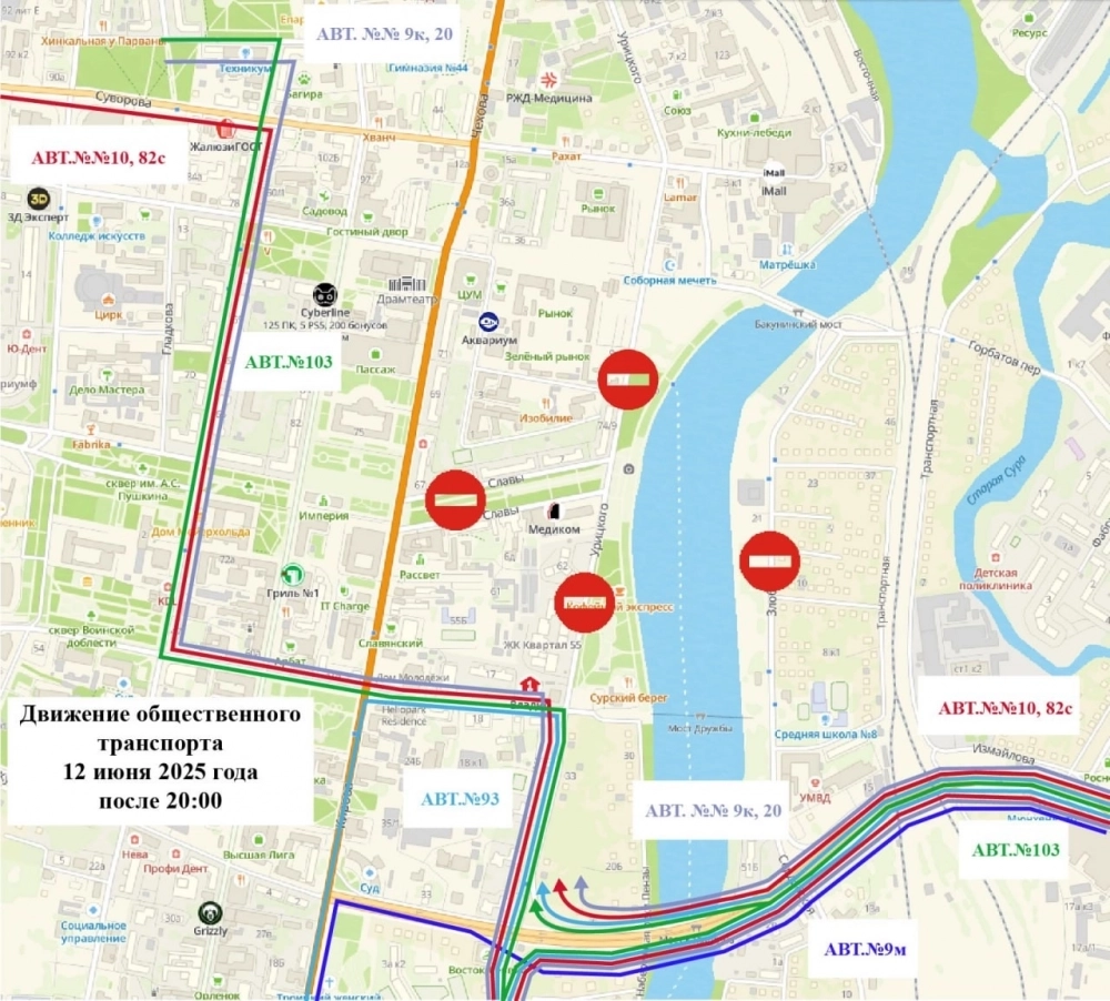 - маршруты №9К, 10, 20, 82С, 103 с ул. Суворова проследуют по следующим улицам: Володарского - М. Горького - Урицкого - мост им. В.П. Капашина и далее по маршрутам в оба направления;