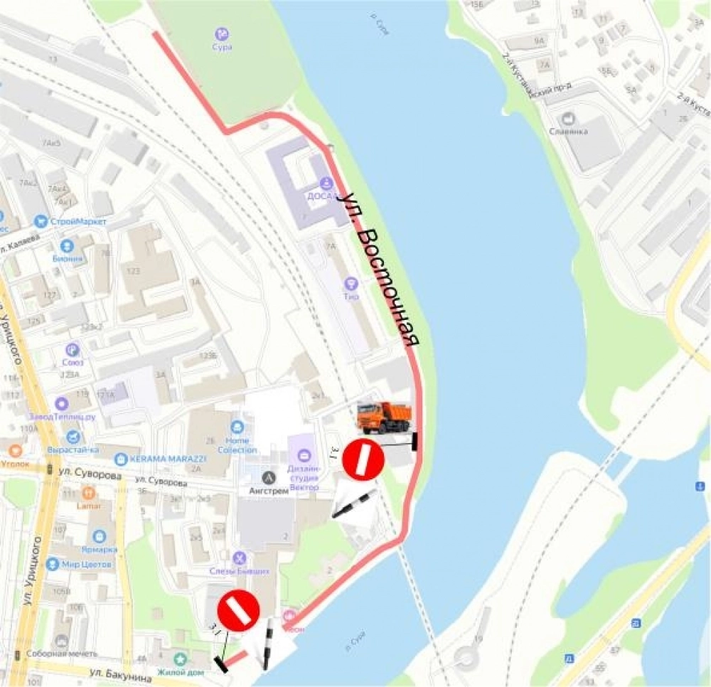 Будет запрещена стоянка и движения транспорта от ул. Бакунина до пересечения с железнодорожным полотном (район мотодрома «Сура»).