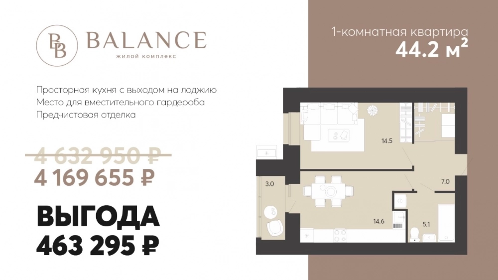 В акции «Время выгодных решений» только в эти семь дней принимает участие уютная квартира в 44 квадратных метра в кирпичном доме комфорт-класса. При входе есть место для вместительного гардероба. Из просторной кухни — выход на лоджию. Из спальни открываются виды во двор. И в комнатах, и в санузле выполнена предчистовая отделка. Поэтому времени на переезд много не потребуется.