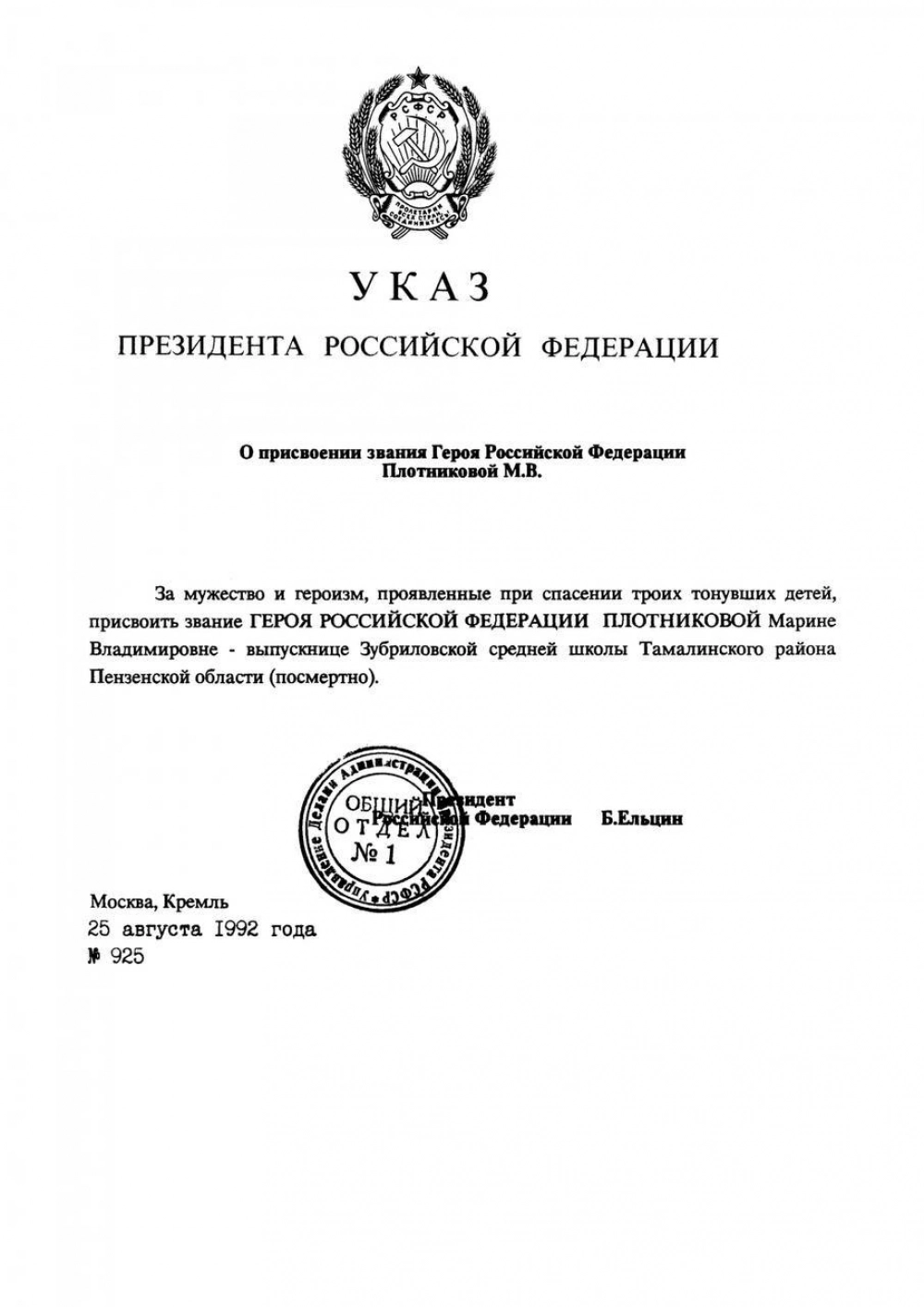 25 августа 1992 года Указом Президента РФ Марине Плотниковой посмертно присвоили звание Героя Российской Федерации - «за мужество и героизм, проявленные при спасении троих тонувших детей».
