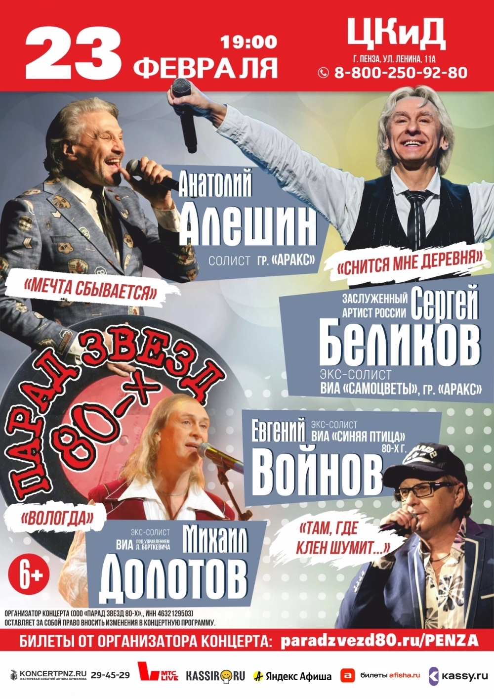Концерт состоится 23 февраля в ЦКиД в 19-00. Стоимость билетов от 1200 рублей. Идут продажи во всех кассах города. На нашем сайте цены на билеты дешевле. Сайт: /paradzvezd80.ru/PENZA