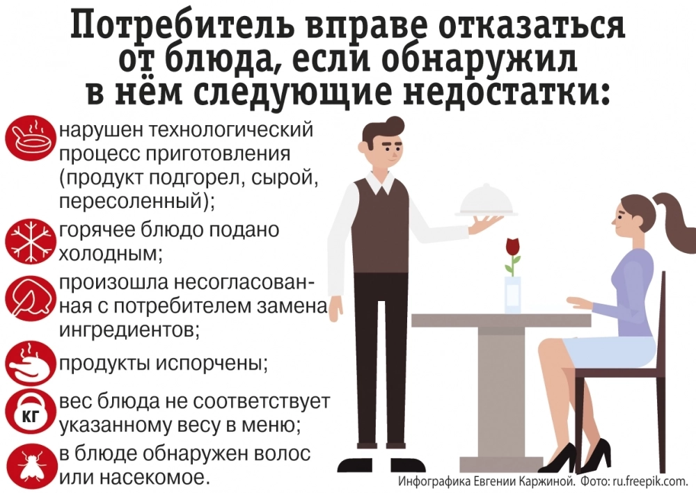 — Эти условия чётко оговорены законом, и мне не хочется, чтобы мой ответ стал памяткой для недобросовестных граждан. Однако эти условия сильно дисциплинируют точки общественного питания. Например, при прибытии в ресторан посетителя обязаны уведомить о способах расчёта. Вполне может так оказаться, что безналичная оплата там не предусмотрена, а наличных средств у вас при себе просто нет. В случае непредупреждения о возможных способах оплаты вы можете не платить за обед. Также вы имеете право не платить за блюдо, которое принесли по ошибке, то есть за еду, которую вы не заказывали, но она почему-то оказалась в чеке.
