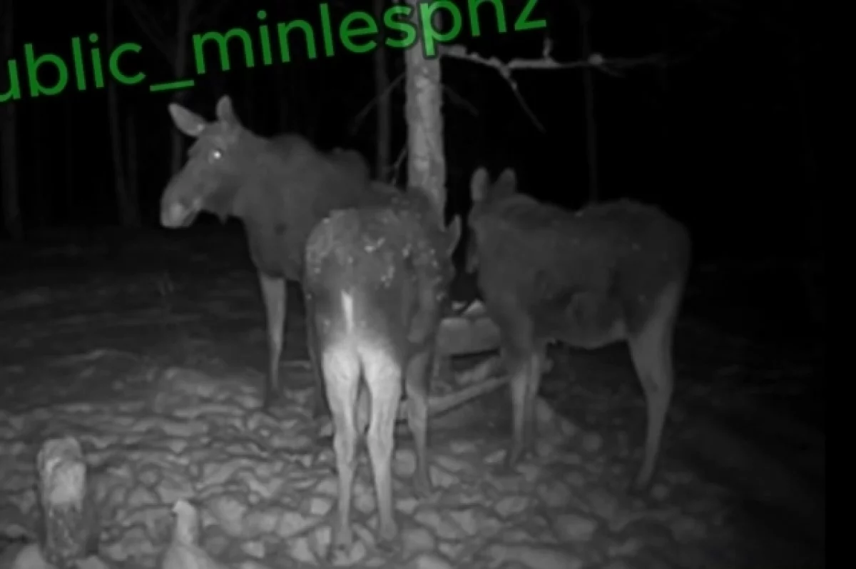 В Пензенской области трое лосей выходили на солонец в поисках пищи.