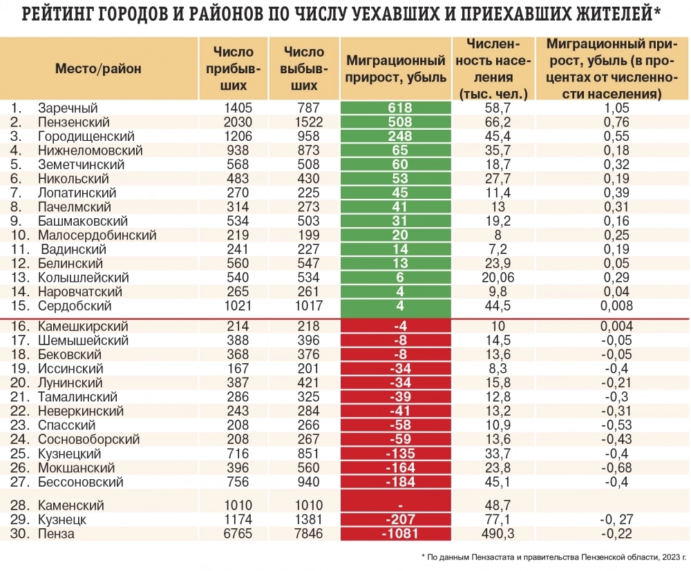 Стабильно в лидерах по миграционному приросту не Пенза, а Пензенский район. В 2023 году за счёт него в муниципалитете прибавилось 0,7 % населения — это один из самых высоких показателей в регионе.