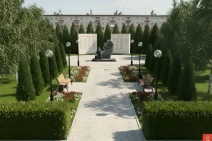 Центральной композицией станет фигура солдата, присевшего на колено (символ скорби и стойкости), разрушенная стена, символизирующая тяжесть боевых действий и голубь мира, взлетающий из-за следа взрыва.